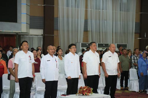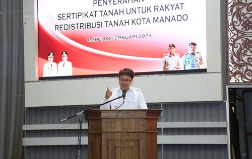 Manado – Wali Kota Manado Andrei Angouw bersama Wakil Wali Kota Richard Sualang menghadiri kegiatan Penyerahan Sertifikat Hak Atas Tanah Hasil Kegiatan Redistribusi Tanah di Ruang Serbaguna Kantor Wali Kota Manado. Rabu (08/02/2023).