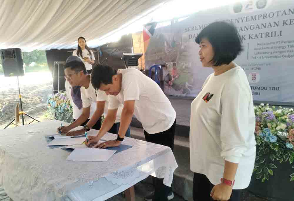 Tomohon,-PT Pertamina Geothermal Energy Tbk Area Lahendong melakukan kerja sama dengan Universitas Gadjah Mada (UGM), dalam seremonial Penyemprotan Demplot Pupuk Katrili, yang bersumber dari endapan uap panas bumi,bertempat di Perkebunan Tember Desa Tonsewer Kecamatan Tompaso Minahasa. Jumat (26/07/2024).