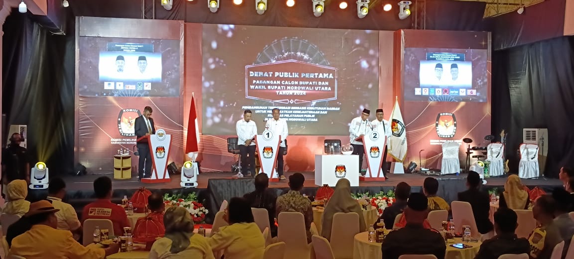 Morut – Komisi Pemilihan Umum Daerah (KPUD) Kabupaten Morowali Utara (Morut) menggelar Debat Kandidat pertama Pilkada Bupati dan Wakil Bupati (Wabup) Morut tahun 2024 di gedung Morokoa Kota Kolonodale, Sabtu,(19/10/2024) malam.