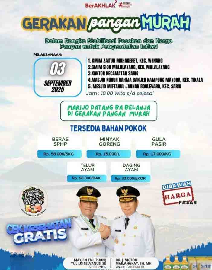 Melalui program Gerakan Pangan Murah yang dikolaborasikan dengan pemeriksaan kesehatan gratis, ribuan warga Kota Manado tumpah ruah mengikuti kegiatan yang dimulai sejak pukul 10.00 WITA.