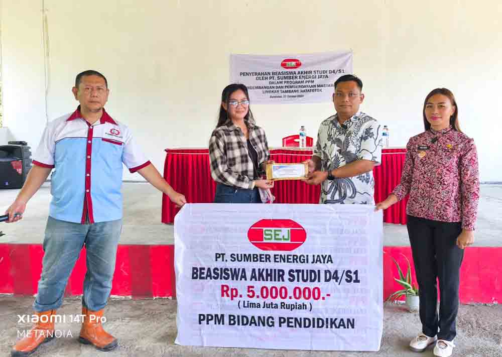 Mitra-PT. Sumber Energi Jaya (SEJ) memberikan bantuan beasiswa akhir studi D4 dan S1 bagi 12 mahasiswa,dalam Program Pengembangan dan Pemberdayaan Masyarakat Lingkar Tambang Ratatotok,pada Kamis (02/10/2025).