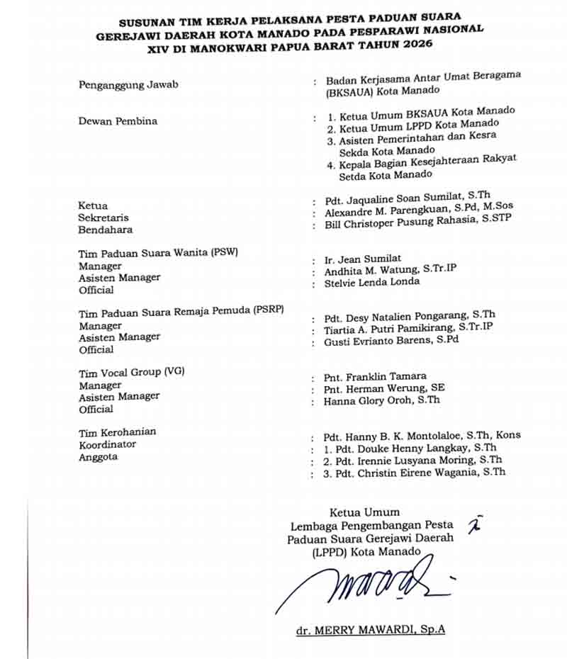 Berikut susunan pengurus Tim Kerja Pesparawi Kota Manado pada Persparawi XIV di Manokwari, Papua Barat: