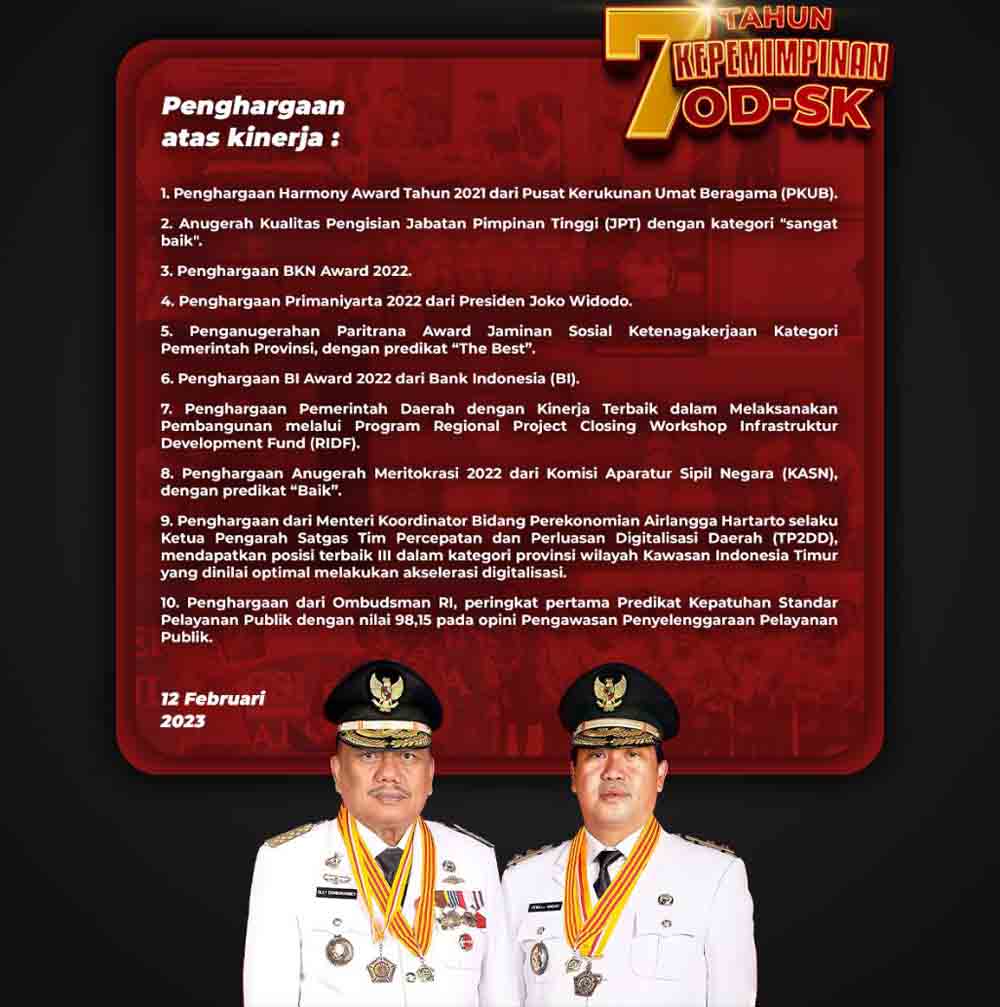 Prestasi demi prestasi ditorehkan oleh Gubernur Sulut Olly Dondokambey dan Wagub Steven Kandouw pada kepemimpinannya sepanjang Tahun 2022 kemarin. Hal ini terbukti dengan diraihnya 10 Penghargaan di berbagai bidang. Ini juga merupakan bentuk bukti bahwa Gubernur Sulut Olly Dondokambey dan Wagub Steven Kandouw terus menjalankan komitmen dalam membangun dan mensejahterahkan masyarakat di Provinsi Sulawesi Utara, tidak hanya slogan, tetapi telah di wujudkan dalam bentuk kerja nyata.