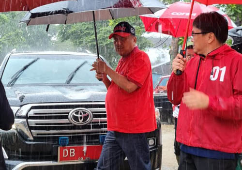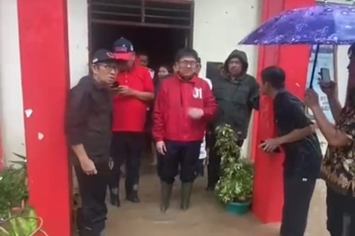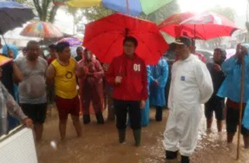 Menggunakan sepatu boot dan memegang payung, Wali Kota menerobos genangan air,serta melakukan dialog dengan beberapa masyarakat, aparat dan pejabat setempat yang terdampak banjir.