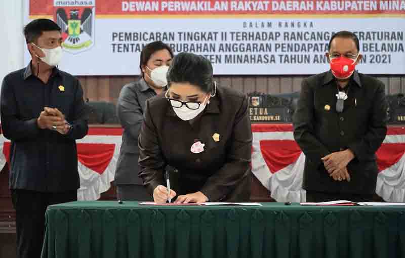 Minahasa – Rancangan Peraturan Daerah (Ranperda) Anggaran dan Pendapatan Belanja Daerah Perubahan Tahun 2021 yang sudah dibahas bersama Pemkab dan DPRD Kabupaten Minahasa, disetujui oleh lima fraksi yang ada di DPRD dan diikuti dengan penandatanganan Naskah Persetujuan Bersama oleh Bupati Minahasa, Dr. Ir. Royke Octavian Roring, M.Si dan Ketua DPRD, Glady E.P Kandouw, SE, Selasa (28/9/2021).