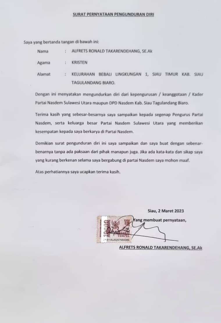 Sekadar diketahui, Kamis (2/3/2023) ART telah menyerahkan surat pengunduran diri di Sekretariat DPW Partai Nasdem. Pada kesempatan itu, ia didampingi Legislator Nasdem yang juga Ketua Komisi I DPRD Sitaro, Evenson Liempepas. ART sendiri pada Pilkada tahun 2018 lalu berpasangan dengan Jutixel Rudolf Perera (ART-JUARA) menempati posisi kedua peraih suara terbanyak. Kalah itu partai Golkar menjadi yang terdepan dalam memberi dukungan meski kala itu pasangan ini merupakan pendatang baru di pentas politik tanah Karangetang, Mandolokang dan Kolo-kolo. (heri/*)