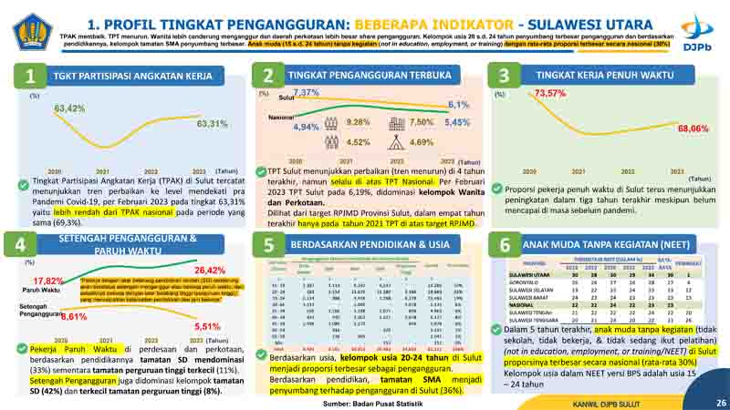 “Demikian pula, tingkat kemiskinan yang turun ke level 9,36% pada Maret 2023 secara y-o-y. Dengan demikian, di tingkat nasional kondisi lapangan kerja dan kemiskinan terus menunjukkan perbaikan. Perlambatan terjadi pada tren ekspor namun demikian perlambatan lebih dalam juga dialami pada impor.” Ujar Kakanwil DJPb Sulut.