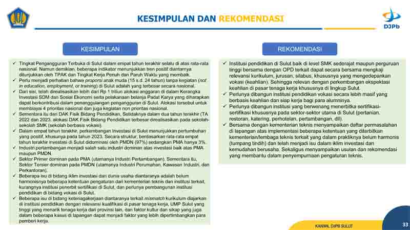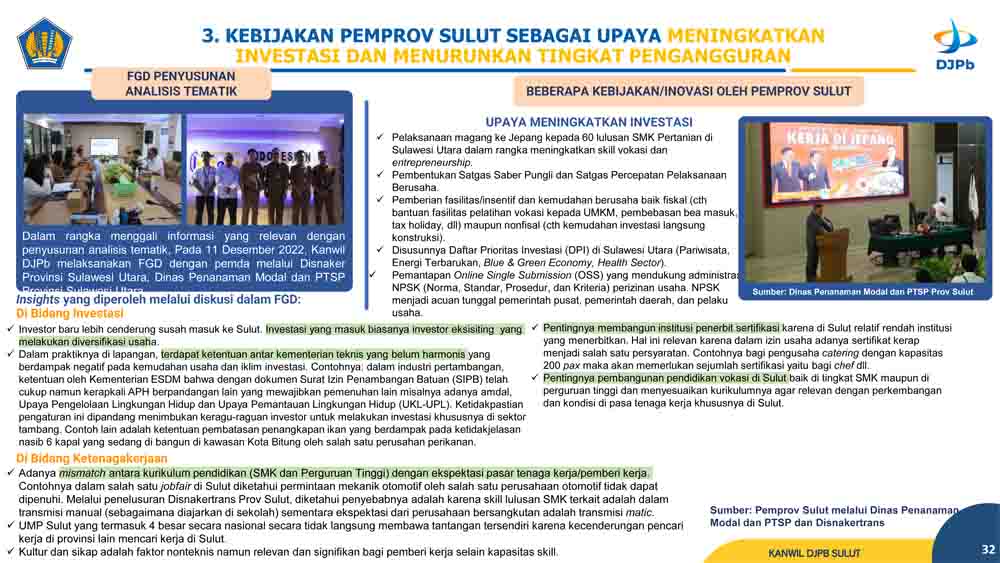 Kegiatan yang di gelar di Gedung Keuangan Negara ini,mengangkat topik “Analisis Faktor-Faktor Penyebab Tingkat Pengangguran,Serta Peran Fiskal Dalam Upaya Pengurangan Pengangguran”, dan di hadiri para Narasumber melalui zoom meeting di antaranya, dari Kanwil DJP Suluttenggo Malut,BPS Provinsi Sulut,Kanwil Direktorat Jenderal Bea dan Cukai Sulut,KPPN Manado. serta Kanwil DJPb Sulut.