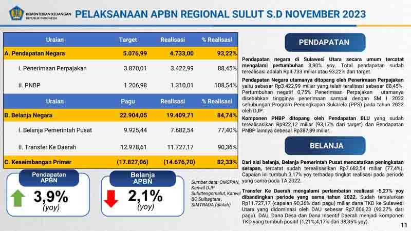 Dari sisi Belanja APBN, telah terealisasi sebesar 84,74% dari pagu, terkontraksi 2,1% dengan nilai sebesar Rp19,41 triliun. Dana Transfer ke Daerah, Belanja Pegawai dan dan Belanja barang menjadi komponen belanja terbesar yang ada. Belanja Barang telah terealisasikan 74,4% dari total pagu. Sedangkan untuk realisasi Belanja Modal telah terealisasikan 64,95%. Sampai dengan akhir November 2023 ini, berdasarkan pelaksanaan APBN di Sulawesi Utara tercatat defisit sebesar Rp14,67 triliun.