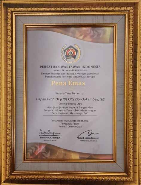 Penghargaan berupa Pena Emas serta piagam Pena Emas, diserahkan langsung oleh Ketua Umum PWI Pusat Hendry Ch. Bangun, kepada Gubernur Olly Dondokambey.