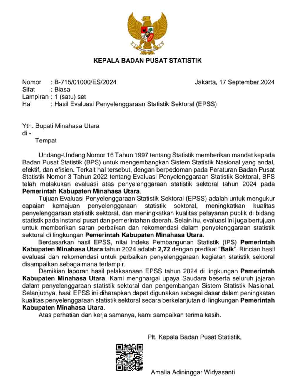 “Berdasarkan hasil EPSS, nilai Indeks Pembangunan Statistik (IPS) Pemerintah Kabupaten Minahasa Utara untuk tahun 2024 adalah 2,72 dengan predikat ‘Baik’. Rincian evaluasi dan rekomendasi perbaikan dalam penyelenggaraan kegiatan statistik sektoral telah disampaikan secara terlampir,” ungkap Parengkuan. Rabu (16/10/2024).