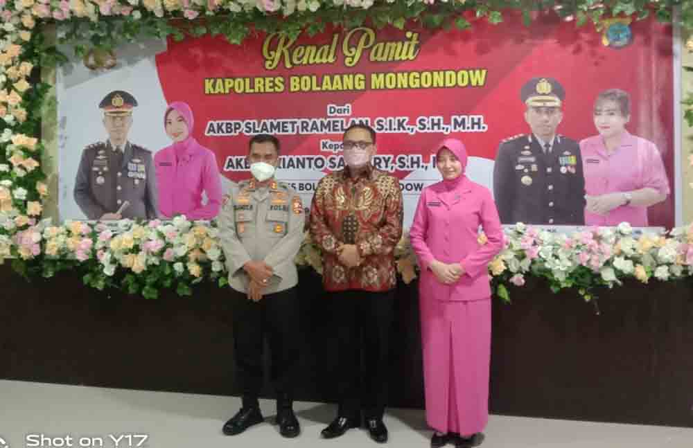 Bupati Limi dalam sambutannya yang diwakili oleh Sekda Bolmong Tahlis Gallang mengucapkan, terima kasih atas dedikasi dan pengabdian AKBP Slamet Ramelan, SIK, SH, MH, selama menjabat sebagai Kapolres Bolmong.