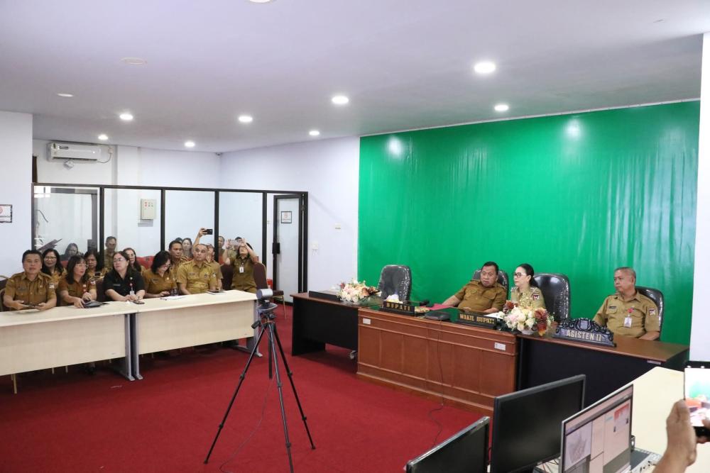Minahasa-Bupati Minahasa Robby Dondokambey, S.Si, MAP. bersama Wakil Bupati Vanda Sarundajang, SS, mengikuti Rapat Koordinasi Pengendalian Inflasi melalui zoom meeting yang dilaksanakan Kementerian Dalam Negeri RI,bertempat ruang kantor pemkab, Senin (23/06/2025).