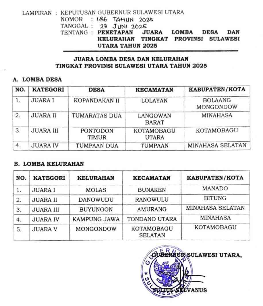 Penetapan ini berdasarkan hasil penilaian lapangan yang dilaksanakan oleh panitia lomba desa dari Dinas Pemberdayaan Masyarakat dan Desa (PMD) Provinsi Sulut sesuai SK Gubernur Sulut Nomor 186 Tahun 2025.