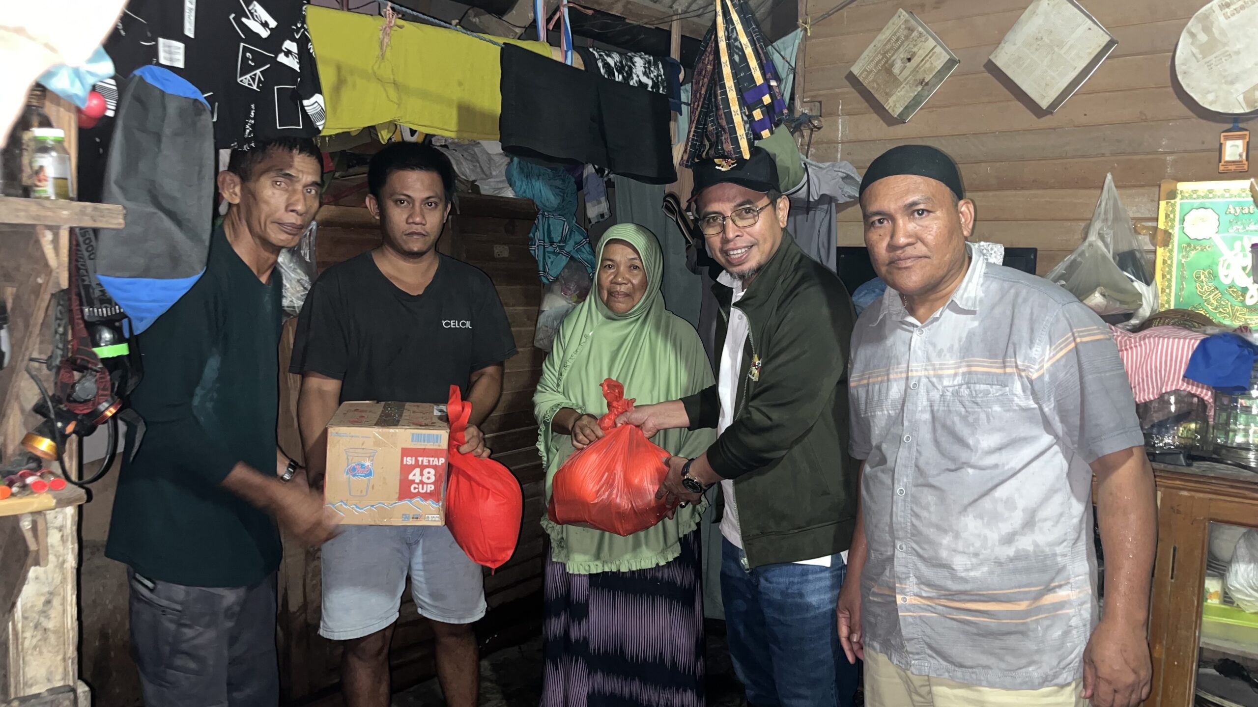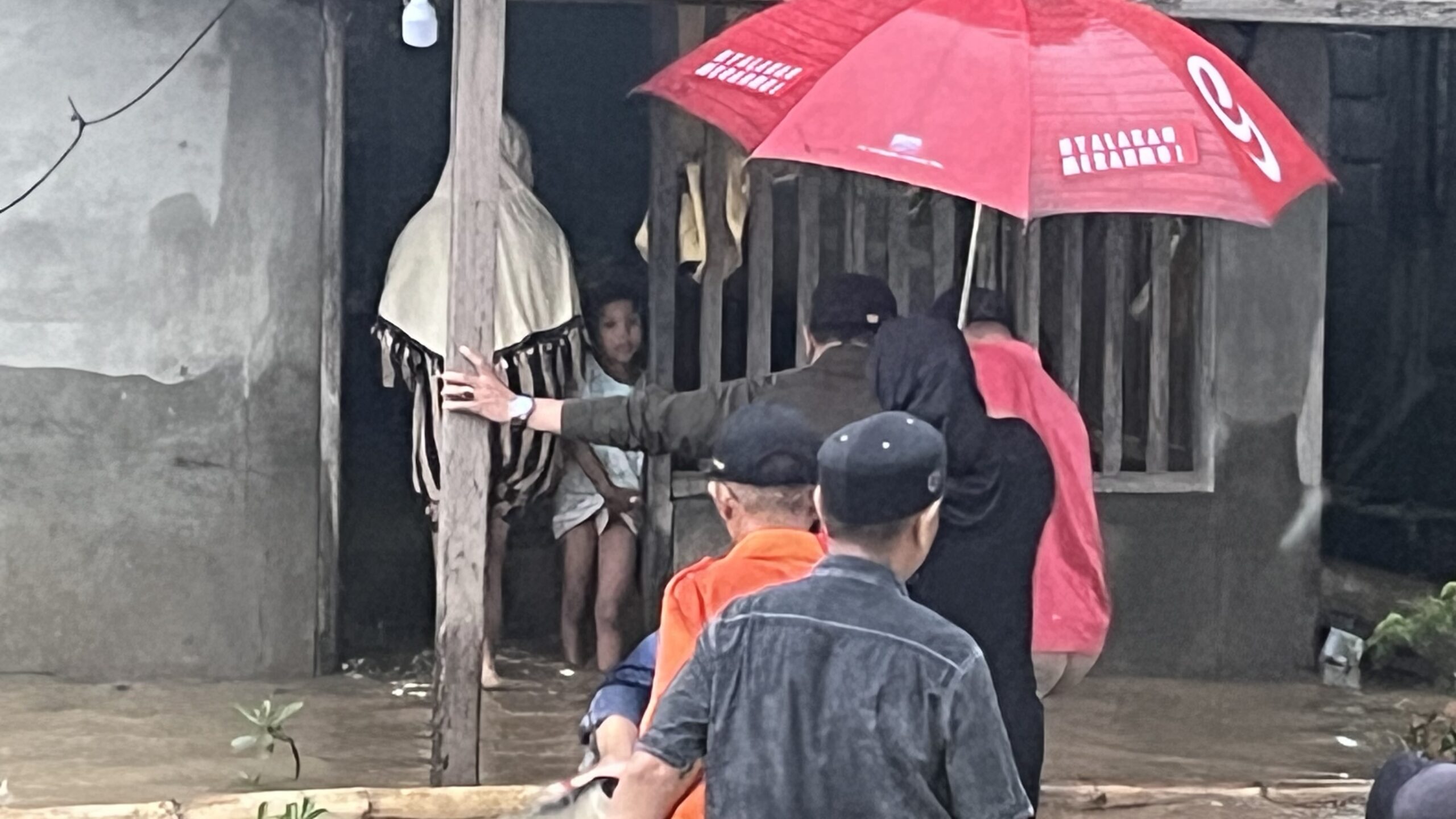 Kehadiran bupati bersama ketua TP-PKK disambut hangat warga yang hujan – hujanan ditengah genangan banjir masih setinggi paha orang dewasa.