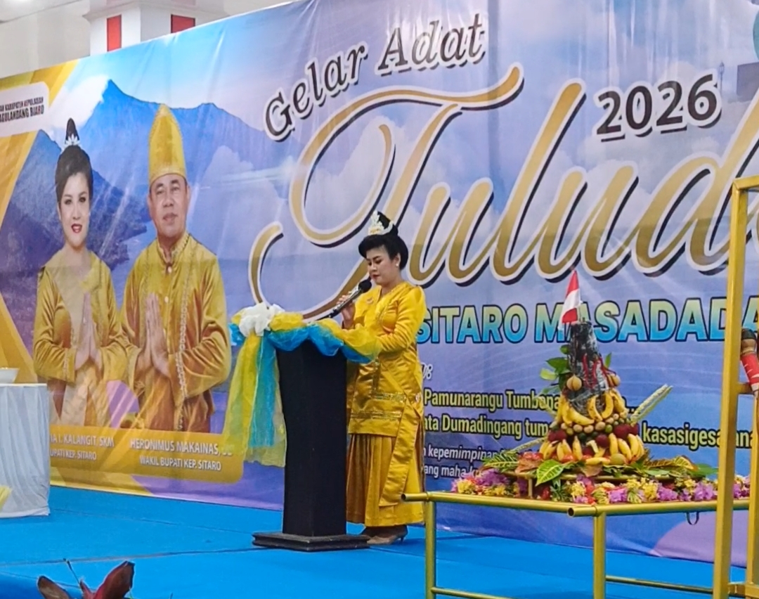 SITARO-Pemerintah Kabupaten Kepulauan Siau Tagulandang Biaro (Sitaro) sukses menggelar perayaan adat Tulude Tahun 2026 yang berlangsung di depan lobi kantor daerah Sitaro, Jumat, (20/02/2026).