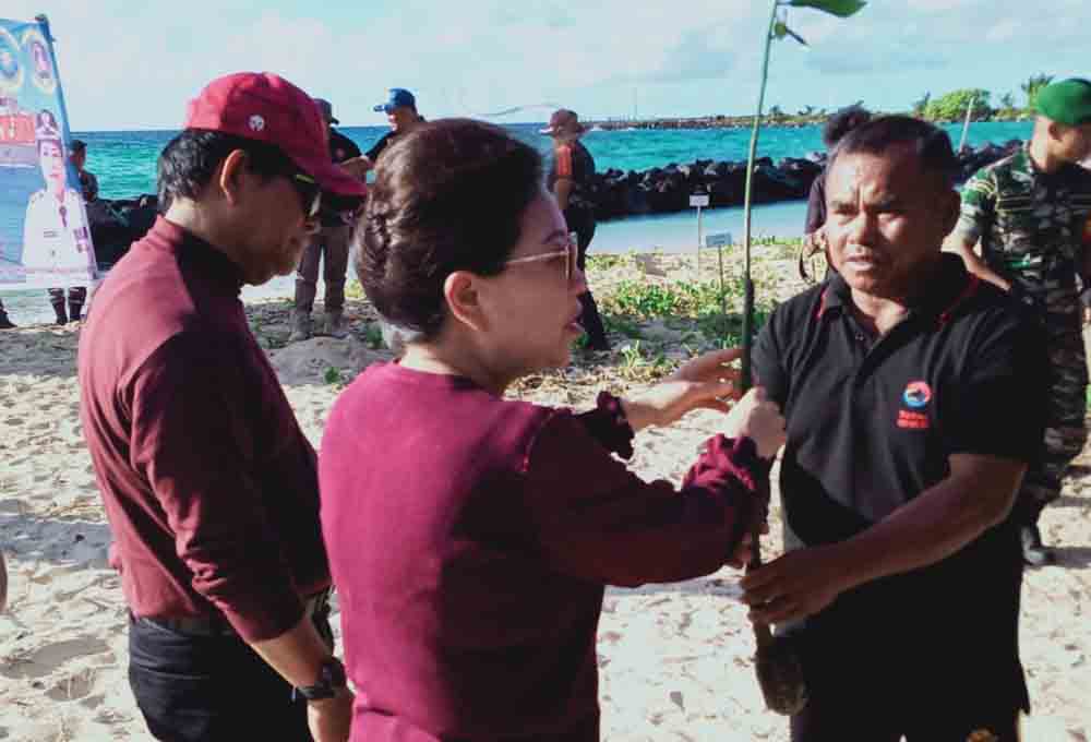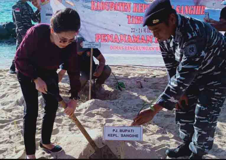 Sangihe-Penjabat Bupati Kabupaten kepulauan Sangihe dr Rinny Tamuntuan didampingi Ketua DPRD Provinsi Sulut dr Fransiscus A Silangen melakukan penanaman Mangrove di kepulauan Marore kecamatan Marore, di pulau terluar perbatasan NKRI, Jumat (24/3/2023).
