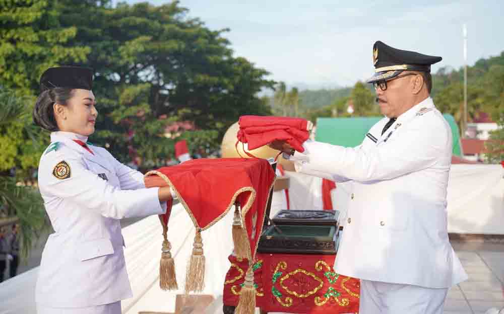 Pj Bupati Bolmong, Ir. Limi Mokodompit yang bertindak sebagai Inspektur Upacara, memimpin langsung prosesi penyerahan bendera pusaka merah putih untuk segera dikibarkan.