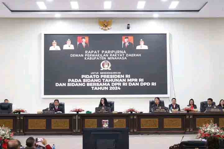 Minahasa,-DPRD Minahasa menggelar Rapat Paripurna Istimewa,mendengarkan Pidato Presiden Republik Indonesia Memperingati HUT RI Ke-79 Pada Sidang Tahunan MPR-RI dan Sidang Bersama DPR-RI dan DPD-RI Tahun 2024,Bertempat di Ruang Sidang DPRD Kabupaten Minahasa, Jumat ( 16/8/2024).