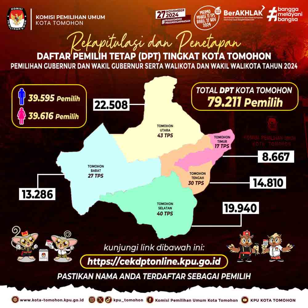 Untuk jumlah DPT Kota Tomohon Total 79.211 pemilih. Adapun rinciannya adalah 39.595 Pemilih Laki-laki dan 39.616 Pemilih Perempuan. (Bert)
