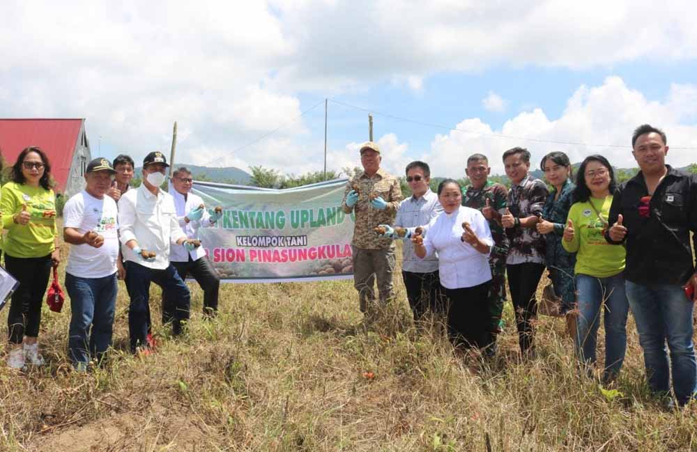 Minsel -Bupati Minahasa Selatan Franky Donny Wongkar, SH bersama Wakil Bupati Minahasa Selatan Pdt. Petra Yani Rembang, melakukan Panen Kentang Program UPLAND dari Kelompok Tani PKB Sion Pinasungkulan, Sabtu (22/10/2022).