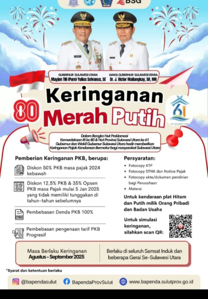 Peluncuran Program Keringanan Pajak Merah Putih menjadi sorotan utama kegiatan tersebut. Program ini disebut sebagai “kado spesial” Pemprov Sulut untuk rakyat, dengan rincian: