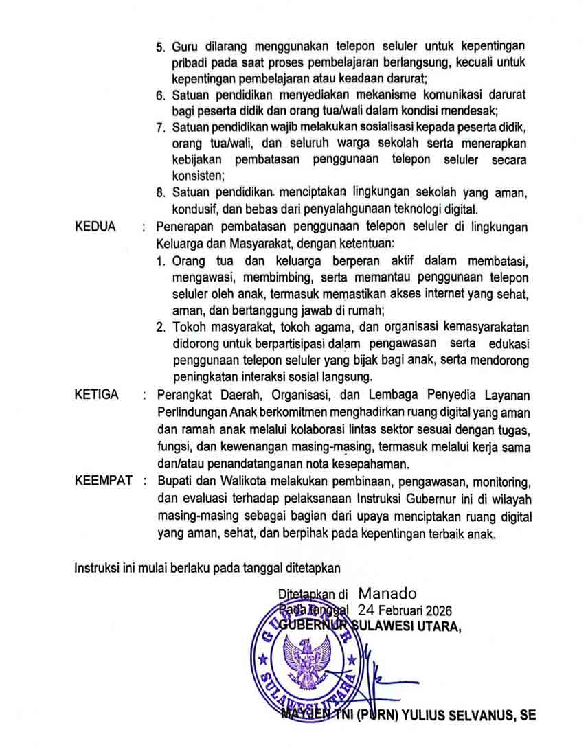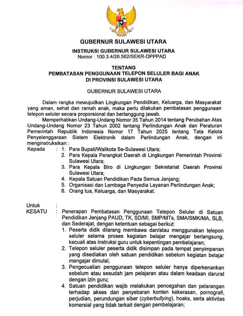 Sulut-Gubernur Sulawesi Utara Mayjen TNI (Purn) Yulius Selvanus, SE menerbitkan Instruksi Gubernur Sulawesi Utara Nomor 100.3.4/26.562/SEKR-DPPPAD tentang pembatasan penggunaan telepon seluler bagi anak di Provinsi Sulawesi Utara.