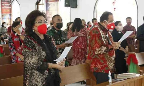 Minahasa – Bupati Minahasa Dr. Ir. Royke Octavian Roring, M.Si bersama Ketua TP-PKK, Ny. Dra. Fenny Roring-Lumanauw, SIP mengikuti Ibadah Oikumene Pemkab Minahasa bersama FKUB, sekaligus Safari Natal menyambut Yesus Kristus. Bertempat di Gereja GEMIM Moria, Kelurahan Sasaran Kecamatan Tondano Utara. Jumat (3/12/2021).