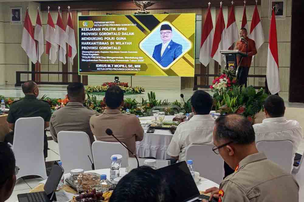 Dalam pemaparannya, Ketua DPRD Provinsi Gorontalo, Idrus Thomas Mopili menyampaikan dukungan kebijakan politik DPRD terhadap penguatan tugas Polri, di antaranya melalui dukungan anggaran hibah dan fasilitas penunjang operasional keamanan, penguatan sarana dan prasarana keamanan wilayah, dukungan terhadap program pembinaan masyarakat (Binmas), serta sinergi program keamanan dalam RKPD dan APBD Tahun 2026.