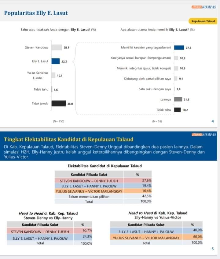Meskipun pasangan *E2L-HJP* berasal dari Kepulauan Talaud, hasil survei menunjukkan bahwa mereka justru tertinggal jauh dengan angka elektabilitas 34,3%.
