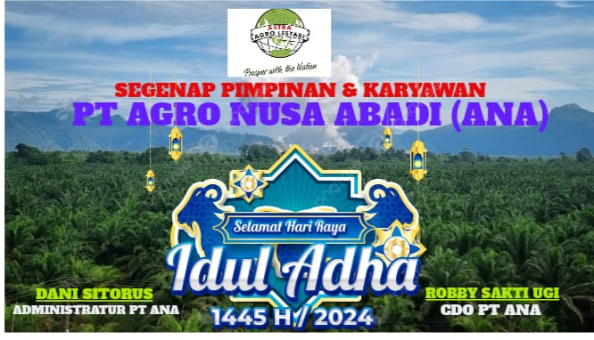 “Keluarga Besar PT AGRO NUSA ABADI (ANA) mengucapkan selamat merayakan Hari Raya Idul Adha 10 Dzulhijjah 1445 Hijiriah. Semoga semangat pengorbanan dan keikhlasan yang diteladankan oleh Nabi Ibrahim AS dan Nabi Ismail AS senantiasa menginspirasi kita semua. Mari kita jadikan momentum ini untuk mempererat tali silaturahmi dan berbagi kebahagiaan dengan sesama.” Ujar CDO PT ANA Robby Sakti Uci dan Dani Sitorus Administratur PT ANA.