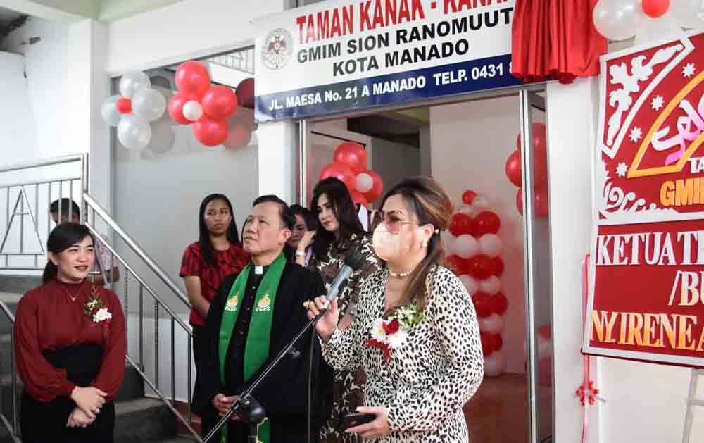 Manado – Ketua TP – PKK Manado Ny. Irene Angouw – Pinontoan mengresmikan Taman Kanak – Kanak GMIM Sion Ranomut yang bertempat di Kelurahan Ranomut Kecamatan Paal 2. Minggu, (7/8/2022).