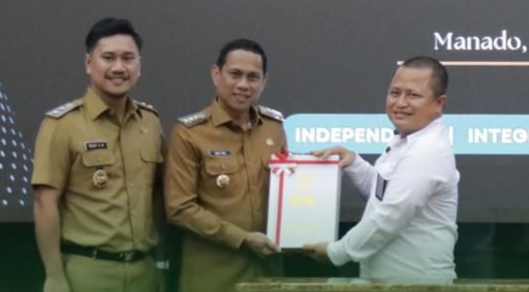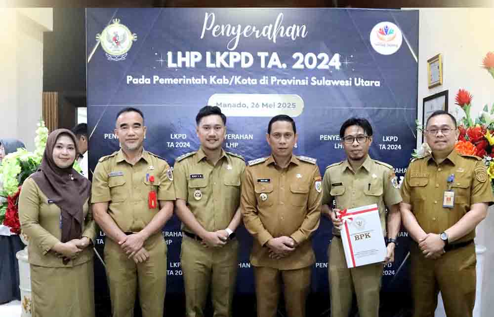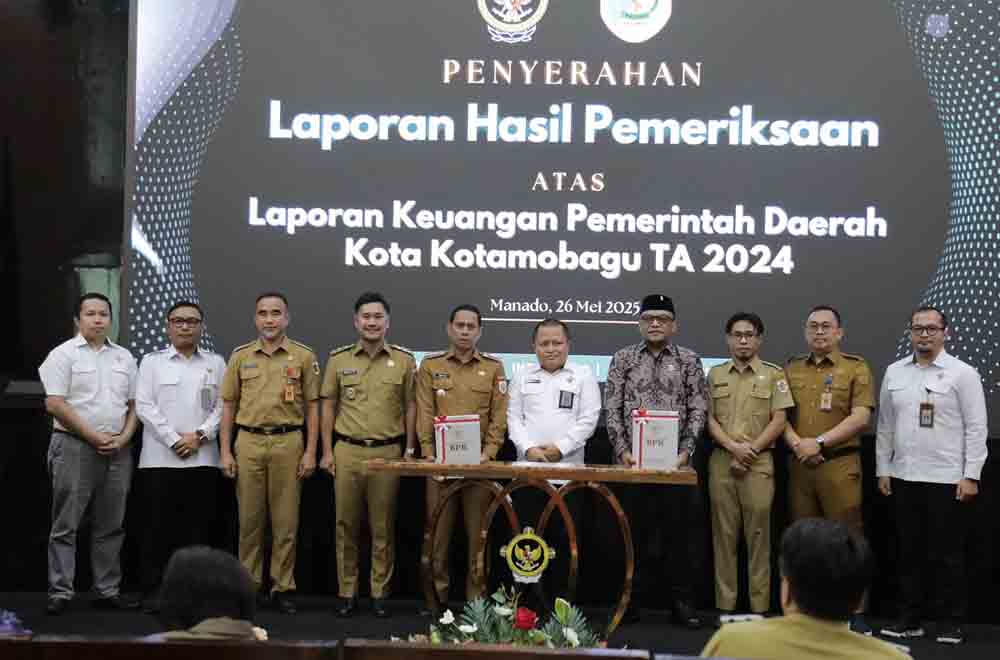 Wali Kota, dr Weny Gaib dan Wawali Rendy Mangkat, menghadiri langsung penyerahan Laporan Hasil Pemeriksaan (LHP) atas Laporan Keuangan Tahun Anggaran 2024, yang berlangsung di Aula Klabat BPK Perwakilan Sulut, Senin (26/5/2025).