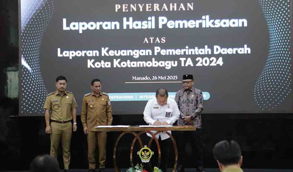 Penyerahan Laporan Hasil Pemeriksaan diserahkan langsung Kepala BPK RI Perwakilan Provinsi Sulawesi Utara, Bombit Agus Mulyo, S.E., M.M., Ak., CA., CSFA, ERMAP, GRCP., GRCA,kepada Weny Gaib dan Rendy Mangkat dan disaksikan langsung Ketua DPRD Kotamobagu, Adrianus Mokoginta SE.