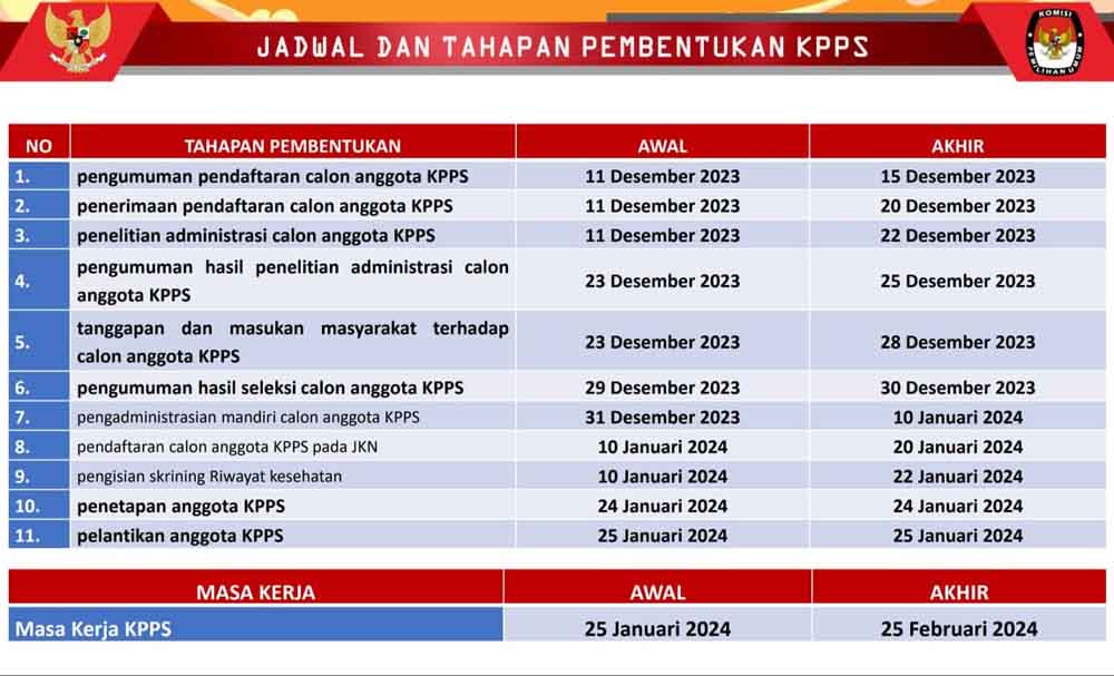 “Pendaftaran hingga pembentukan anggota KPPS Pemilu 2024 terdiri dari beberapa tahapan. Mulai dari pengumuman pendaftaran calon anggota KPPS. Penerimaan pendaftaran calon anggota KPPS. Penelitian administrasi calon anggota KPPS. Pengumuman hasil penelitian administrasi calon anggota KPPS. Tanggapan dan masukan masyarakat terhadap calon anggota KPPS. Pengumuman hasil seleksi calon anggota KPPS, dan terakhir penetapan anggota KPPS,” jelasnya.