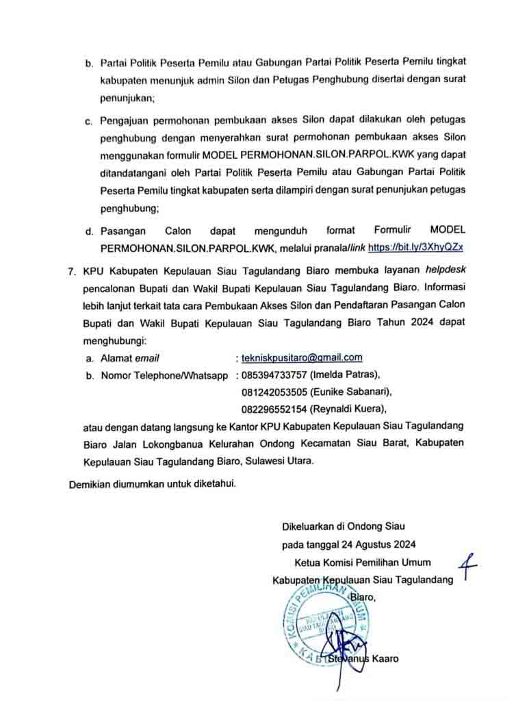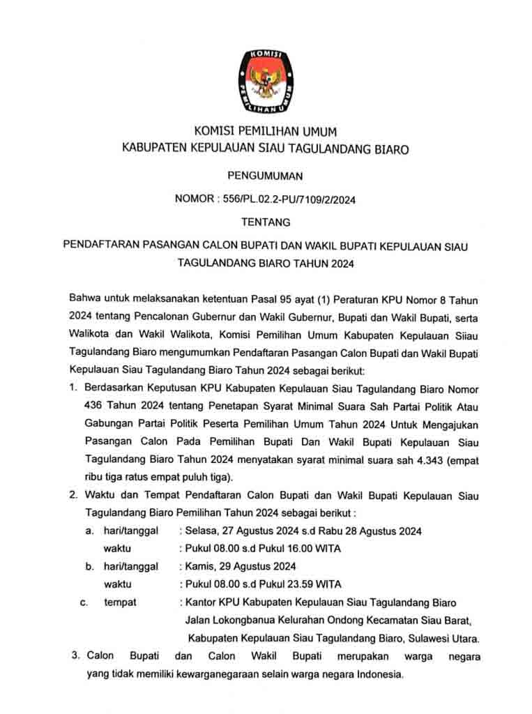 Sitaro,-Komisi Pemilihan Umum (KPU) Kabupaten Kepulauan Siau Tagulandang Biaro (Sitaro) telah mengumumkan secara resmi jadwal dan lokasi pendaftaran untuk pasangan calon (paslon) Bupati dan Wakil Bupati kepl. Sitaro pada Pemilihan Kepala Daerah (Pilkada) 2024.