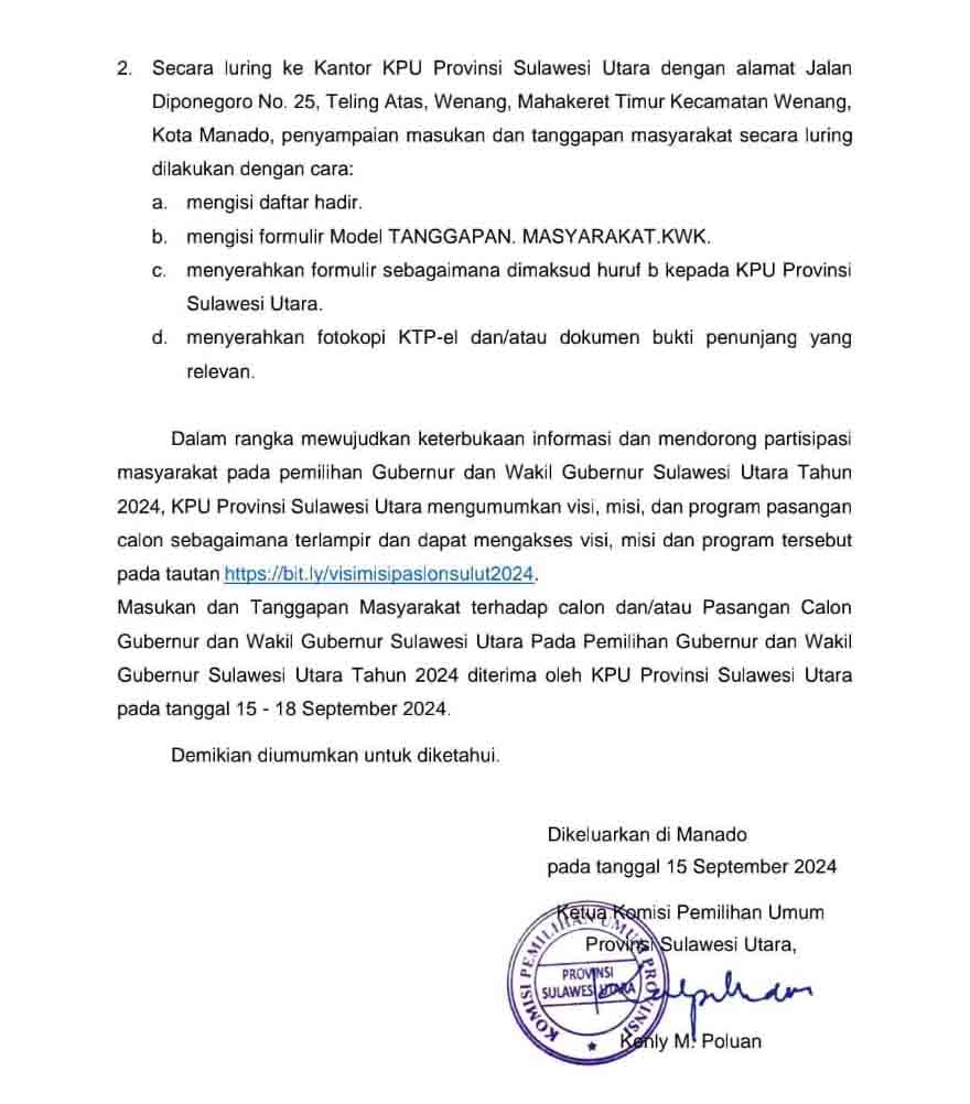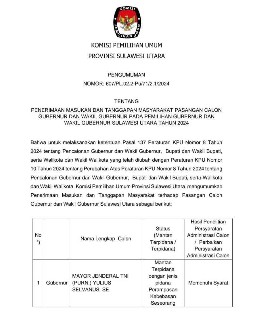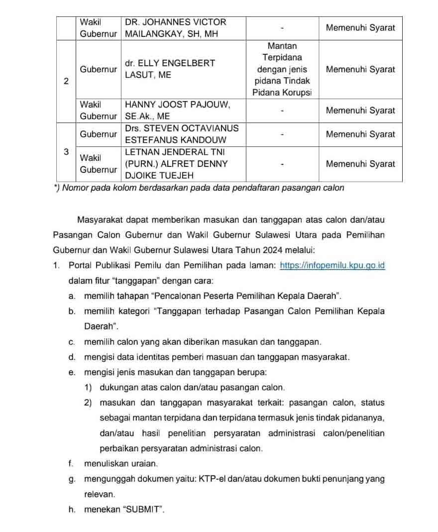 Sulut-Komisi Pemilihan Umum (KPU) Provinsi Sulawesi Utara (Sulut) mengumumkan penerimaan masukan dan tanggapan masyarakat pasangan calon Gubernur dan Wakil Gubernur Sulut Tahun 2024. Adapun pengumuman ini di tanda tangani oleh Ketua KPU Sulut Kenly M.Poluan.