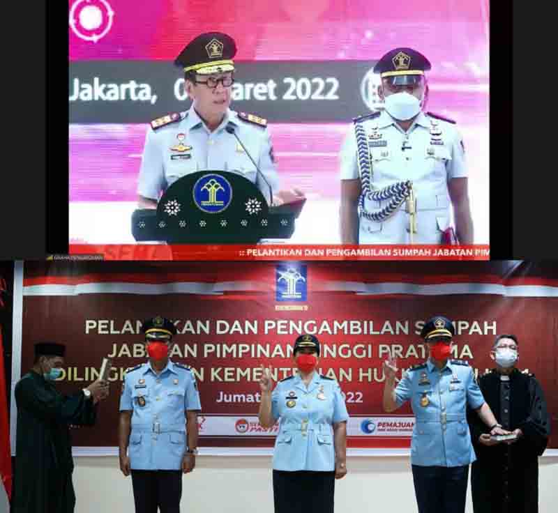 Sulut – Sebanyak 119 Pimpinan Tinggi Pratama dilantik dan diambil sumpahnya di hadapan Menteri Hukum dan HAM Republik Indonesia Yasonna H. Laoly.  Pelantikan dan pengambilan sumpah tersebut dilakukan secara luring dan daring. di Graha Pengayoman, Jakarta, Jumat (04/03/2022).