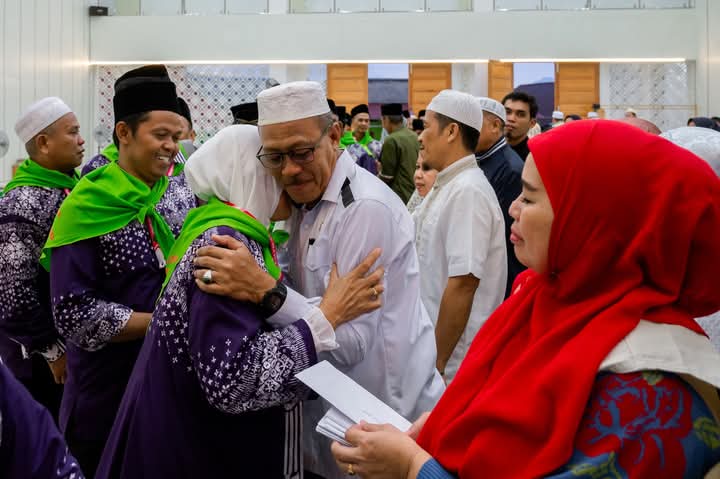 Morut-Rasa haru menyelimuti calon jemaah haji kelompok terbang (kloter) 08 Embarkasi Balikpapan asal Morowali Utara (Morut) yang dilepas oleh Wakil Bupati (Wabup) Morut, H Djira K SPd MPd, di Islamic Center Kompleks Masjid Nurul Bahri Kel Bahoue, Jumat (16/05/2025) subuh.