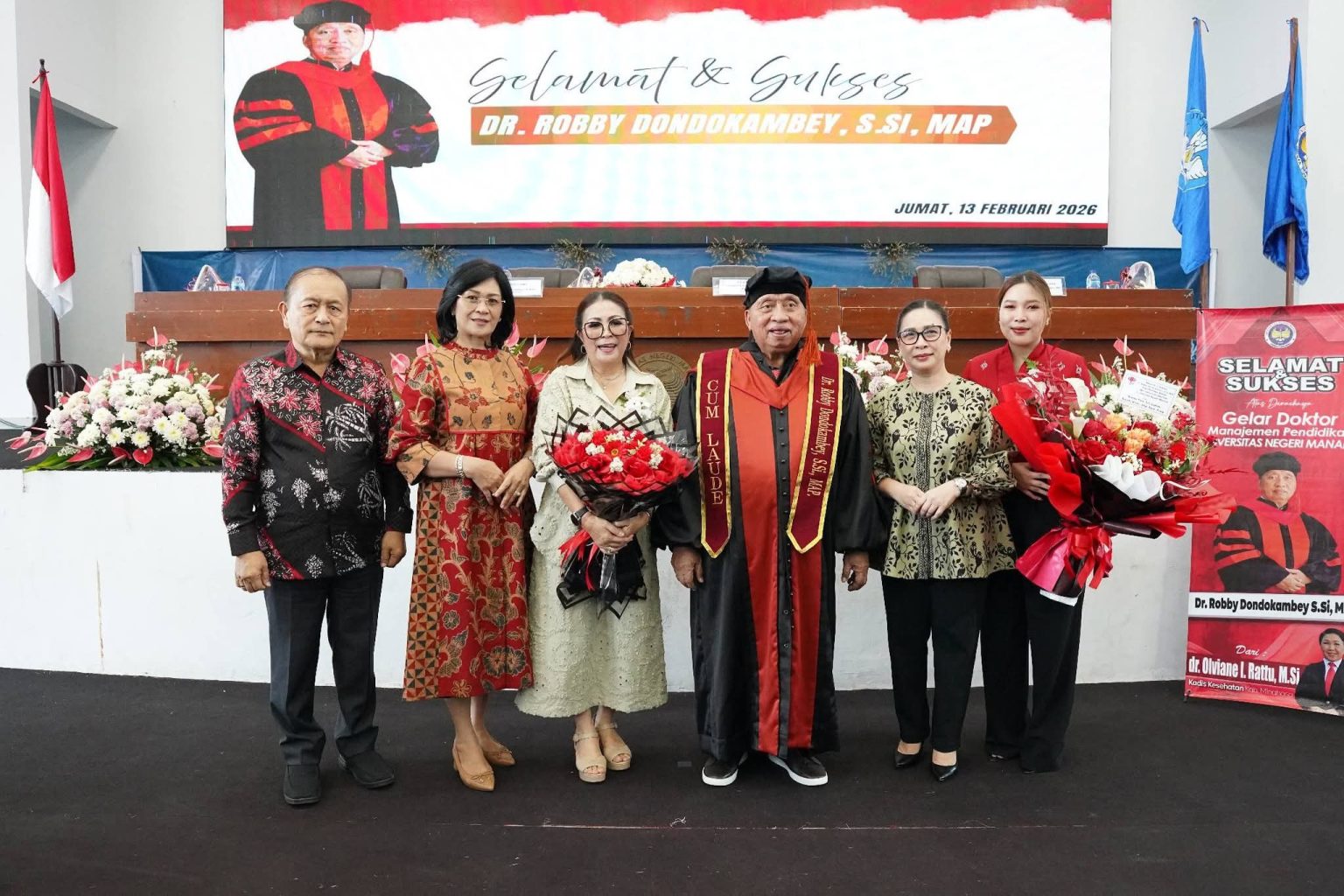Minahasa-Suasana penuh khidmat dan kebanggaan mewarnai pelaksanaan Ujian Promosi Doktor Bupati Minahasa, Dr. Robby Dondokambey, S.Si, MAP, yang digelar di Gedung Training Center Universitas Negeri Manado (UNIMA), Tondano, Jumat (13/2/2026).