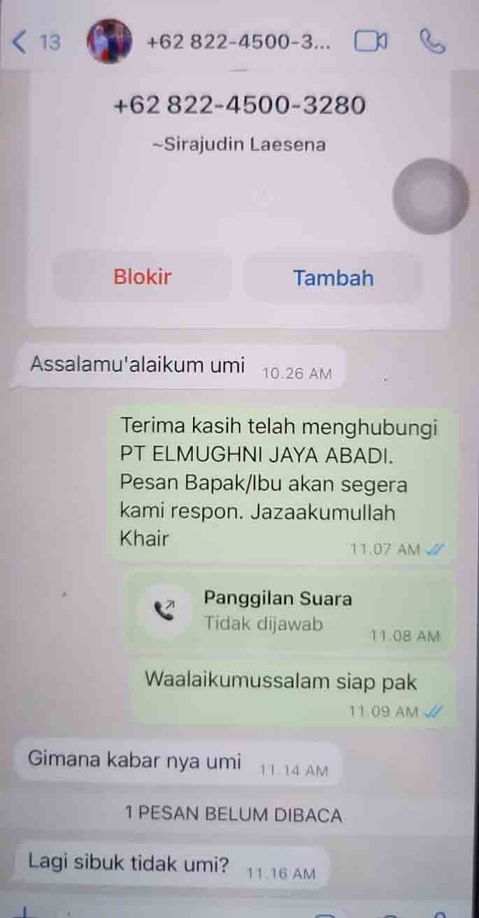 Seperti yang terjadi pada Senin tanggal 03 Juni 2024, nomor handphone dari provider telkomsel +6282245003xxx menghubungi salah satu Aparatur Sipil Negara (ASN) yang bekerja disalah satu rumah sakit di kota Gorontalo dengan menanyakan kabar, namun ketika di hubungi langsung tidak diangkat oleh nomor tersebut melalui akun whatsapp.