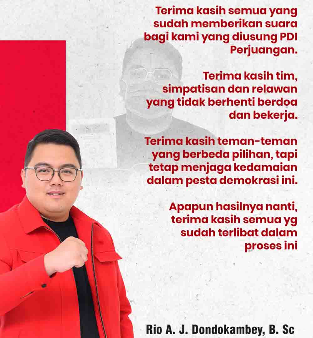 Manado – Caleg PDIP nomor urut 1 Rio Dondokambey mengucapkan terima kasih kepada rakyat Sulut yang sudah memilihnya dalam pemilu 2024.