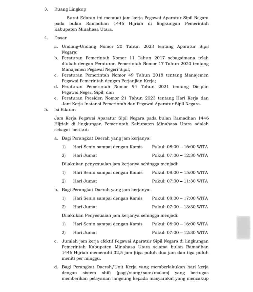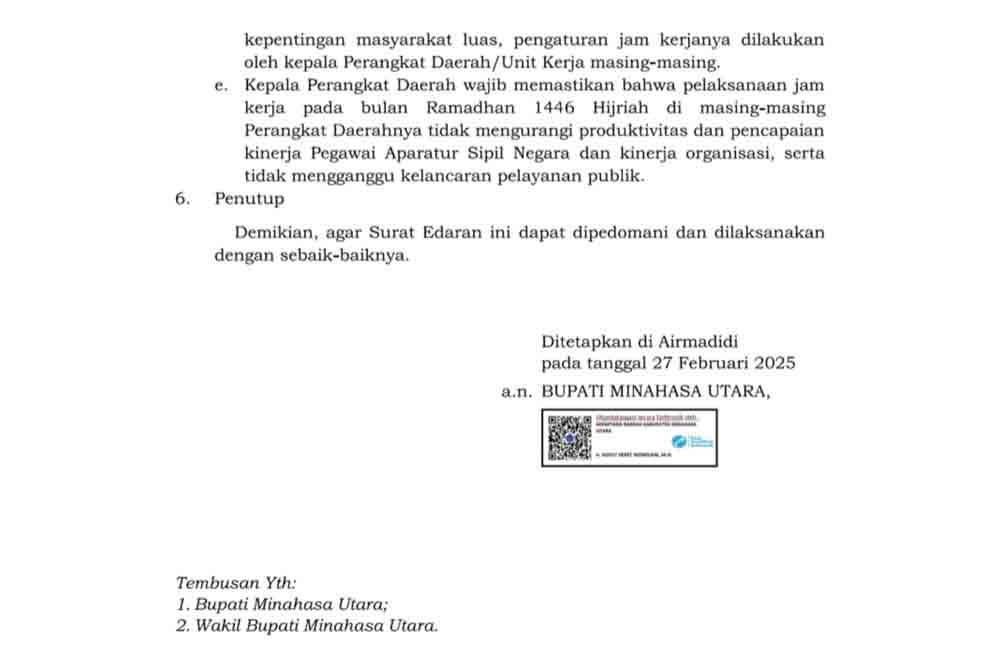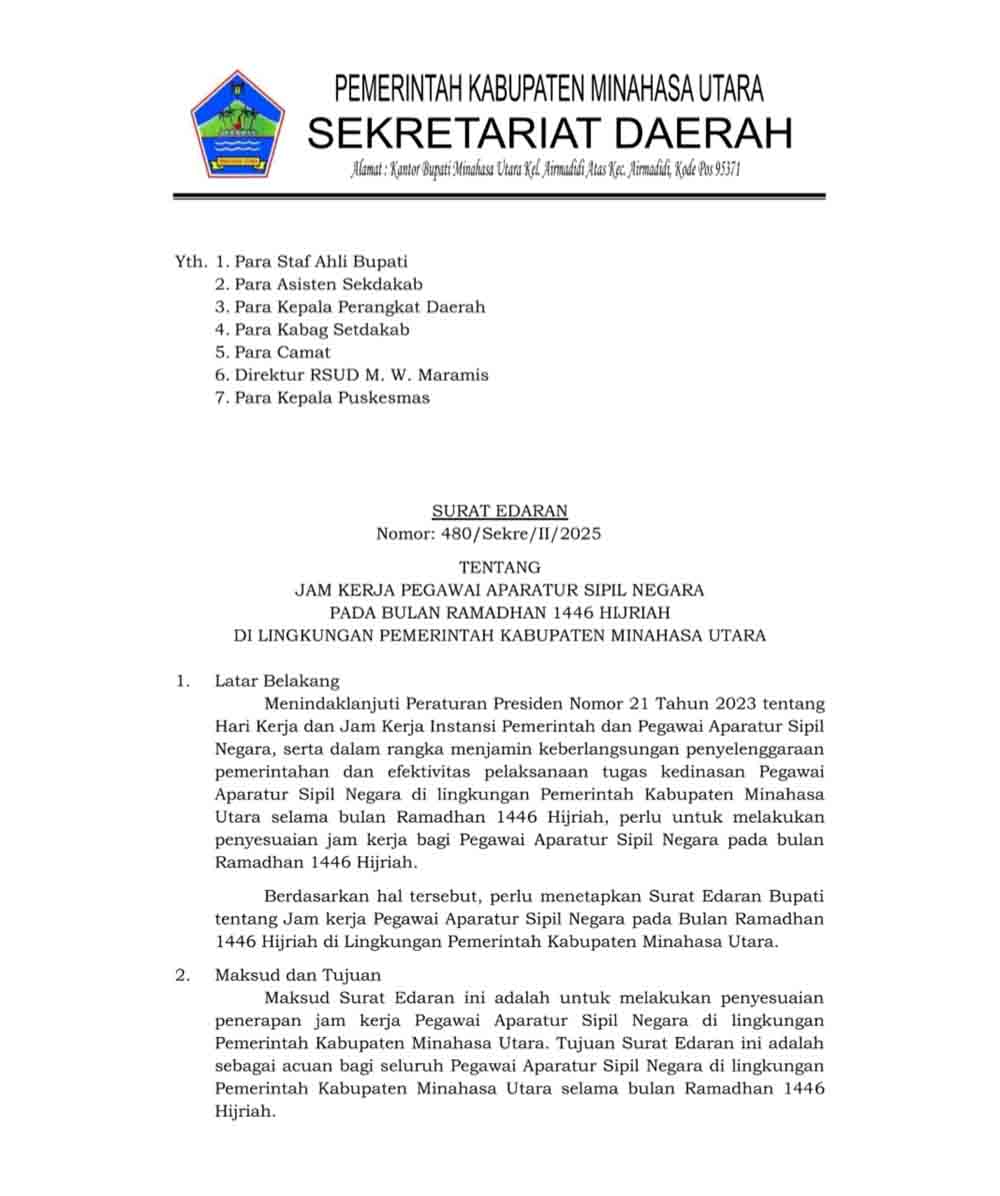 Berikut rincian jam kerja baru bagi ASN di Pemkab Minahasa Utara selama Ramadhan 1446 Hijriah.