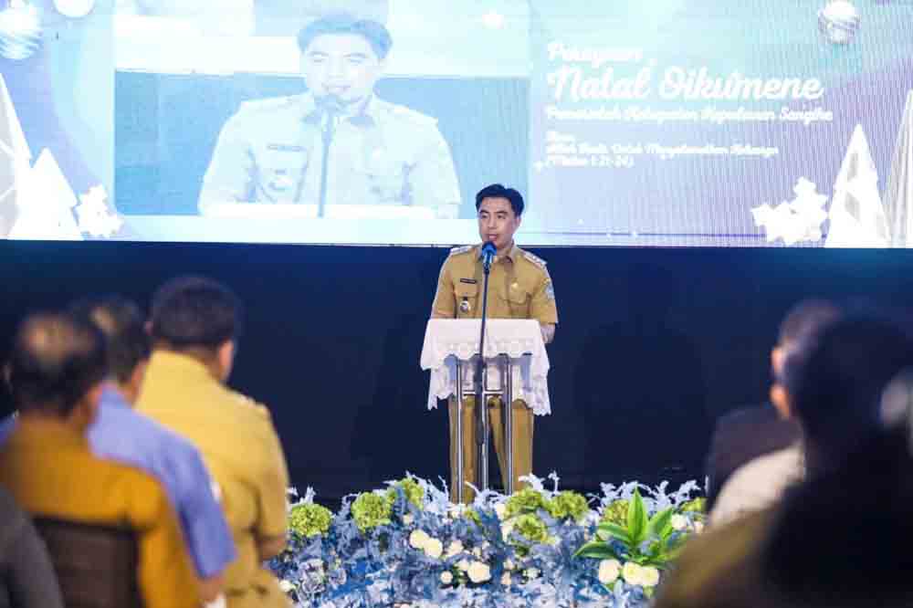 Tahuna-Dengan tema “Allah Hadir Untuk Menyelamatkan Keluarga” Pemerintah Kabupaten Kepulauan Sangihe laksanakan perayaan Natal Oikumene di papanuhung Santiago rumah jabatan Bupati, Senin (08/2/2025).