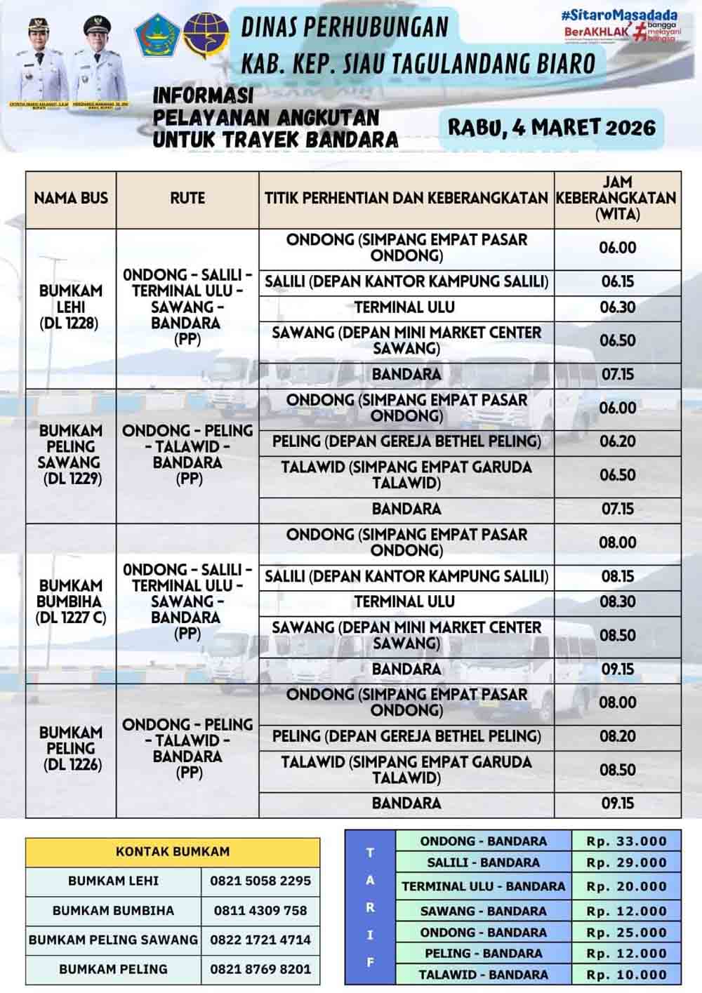 Sitaro-Pemerintah Kabupaten Kepulauan Siau Tagulandang Biaro melalui, Dinas Perhubungan menghadirkan layanan angkutan trayek bandara untuk memudahkan masyarakat yang akan melakukan perjalanan udara, Rabu, (4/3/2026).