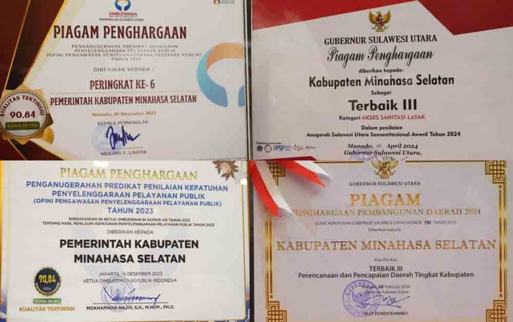 Bupati Minahasa Selatan Franky Donny Wongkar, SH menerima Piagam Penghargaan Penganugerahan Predikat Kepatuhan Penyelenggaraan Pelayanan Publik (Opini Pengawasan Penyelenggaraan Pelayanan Publik) Tahun 2023 Peringkat Ke-6, dengan Nilai 90,84 (Zona Hijau) Kategori A (Kualitas Tertinggi) dari Kepala Ombudsman RI dan Kepala Perwakilan Ombudsman RI Sulawesi Utara, yang diserahkan oleh Kepala Perwakilan Ombudsman RI Sulawesi Utara, dan menerima Penghargaan Pembangunan Daerah 2024 Terbaik III Perencanaan dan Pencapaian Daerah Tingkat Kabupaten, dan Penghargaan Sulawesi Utara Sensanitasional Award Terbaik III Kategori Akses Sanitasi Layak.