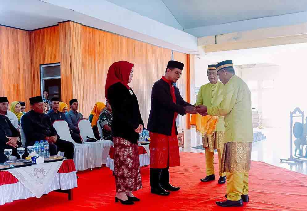 Selanjutnya prosesi pemberian Gelar adat kepada penjabat Bupati Bolmut baru, di awali dengan pemasangan songgo (Kopiah), penyerahan keleso (keris), penyerahan sungguru (Tongkat), serta pemasangan selendang kepada istri Penjabat Bupati Bolmut baru.