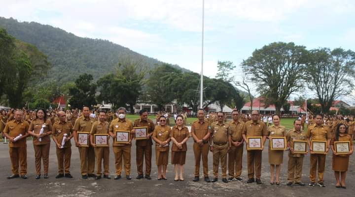 Pj. Bupati Kepulauan Sangihe dr.Rinny Tamuntuan saat apel perdana awal bulan Februari 2023 menyerahkan langsung sertifikat penghargaan bagi para Pemenang Lomba Kebersihan tersebut.