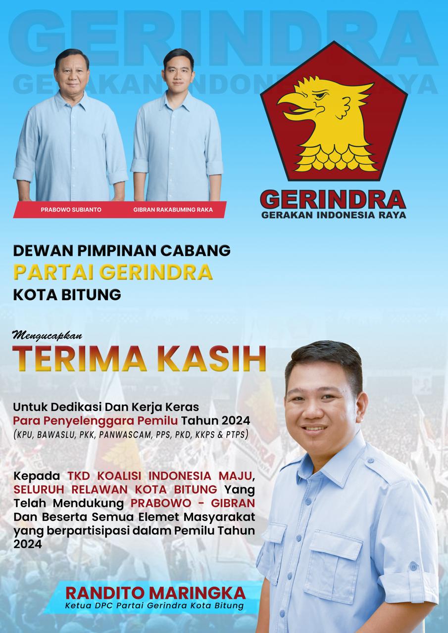 Bitung, Redaksisulut – Calon Legislatif (Caleg) Dewan Perwakilan Rakyat Daerah (DPRD) Kota Bitung dari Partai Gerindra Randito Maringka raih suara terbanyak dengan jumlah 5612 suara.
