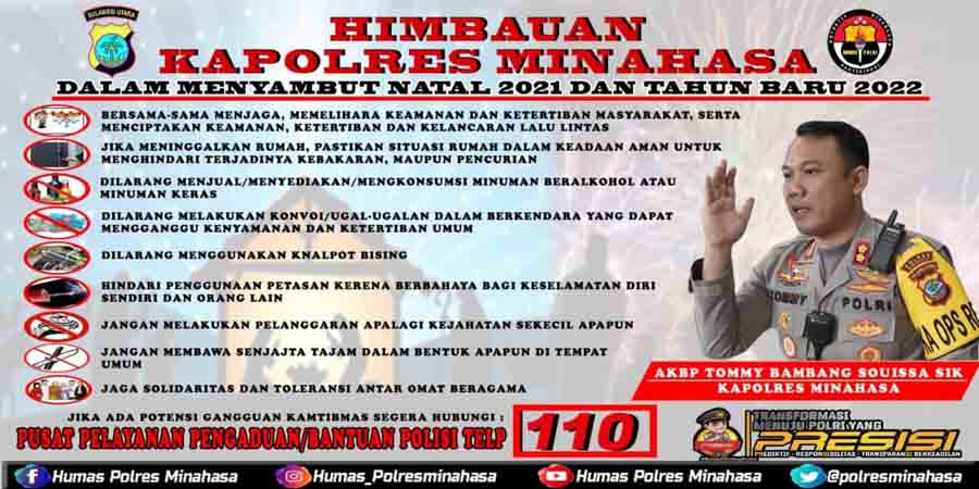 Untuk mengantisipasi berbagai kejadian yang dikhawatirkan akan mengganggu kenyamanan jalannya perayaan Natal dan Tahun Baru, Kapolres Minahasa, AKBP Tommy Bambang Souissa SIk memberikan beberapa imbauan kepada masyarakat di wilayah Polres Minahasa, Jumat (10/12/2021).